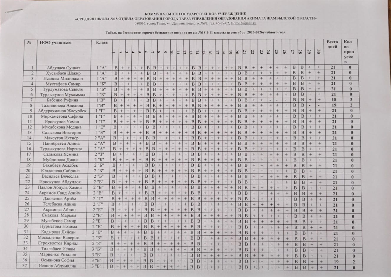 Табель по питанию на сентябрь » "Средняя школа №18"