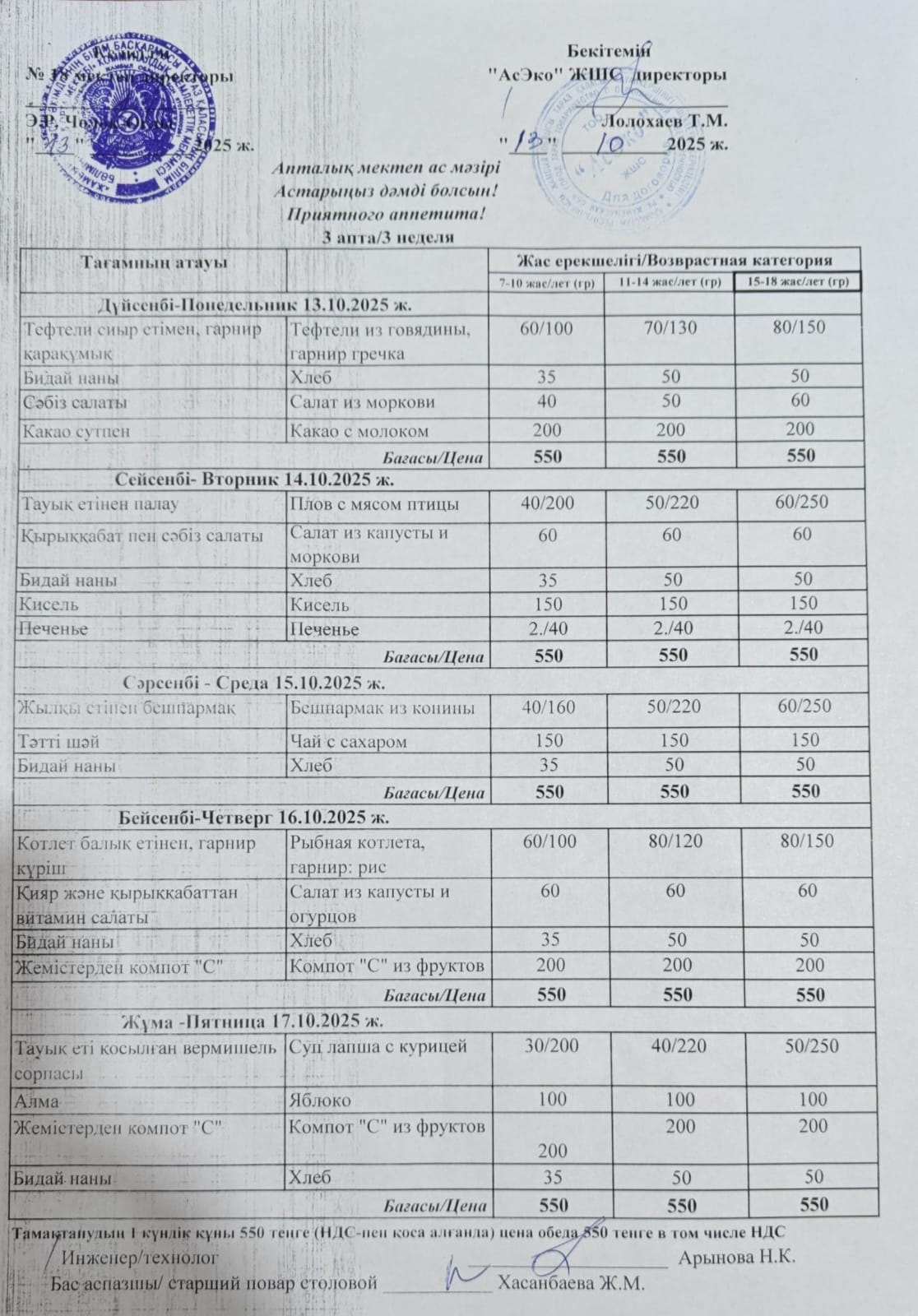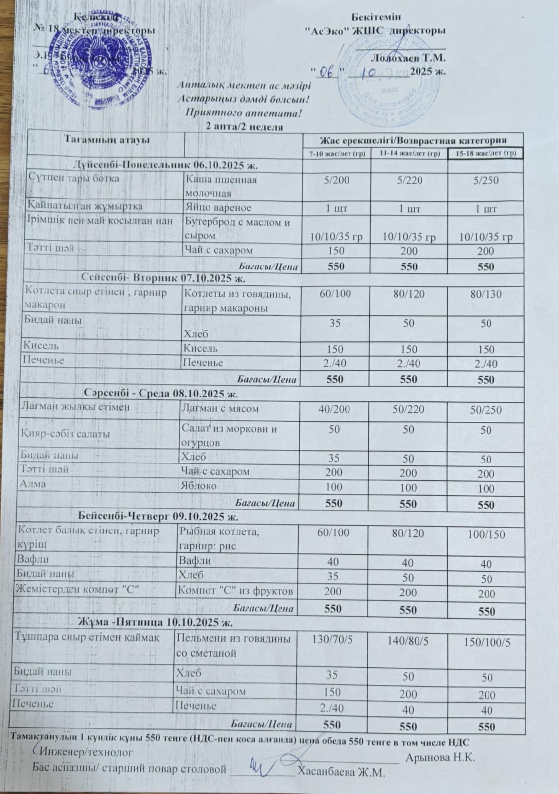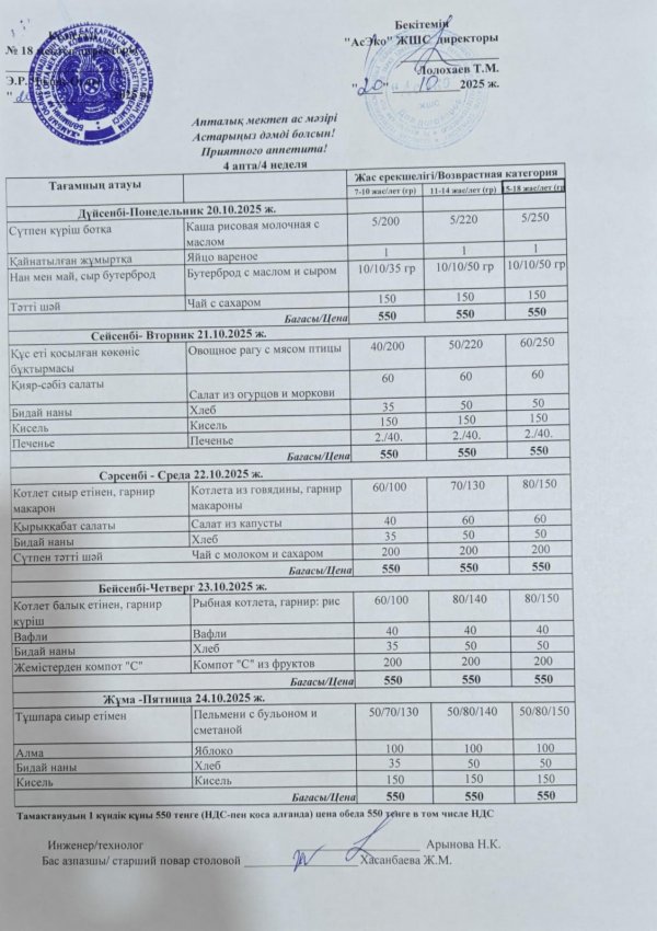 20 октябрь 2021 Меню СШ 18 на 11.10.-16.10